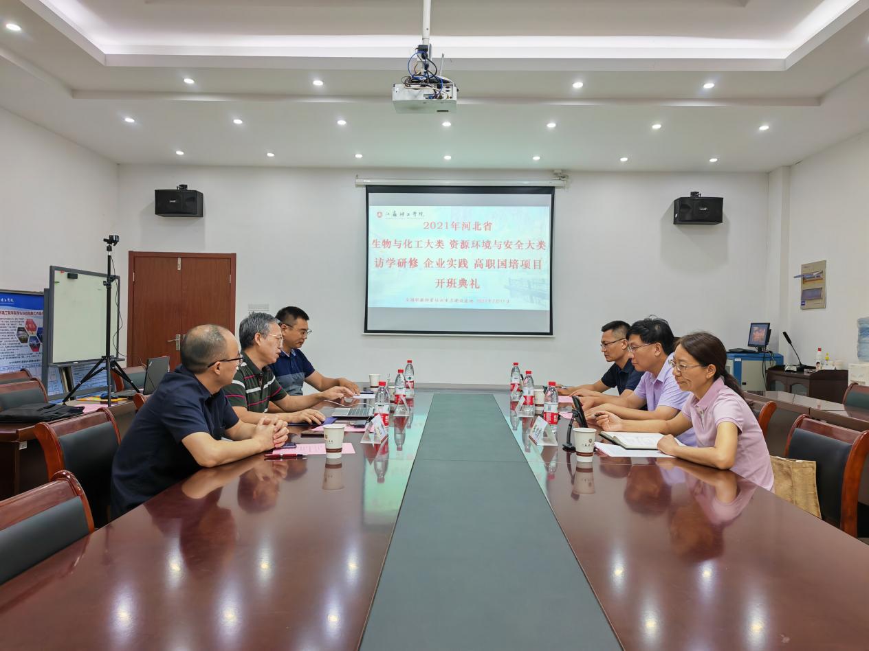 由我院与资源与环境工程学院共同承办的2021年河北省高职院校教师素质提高计划国家级培训项目四个班:生物与化工大类访学研修培训班、企业实践培训班,资源环境与安全大类访学研修培训班、企业实践培训班于7月11日上午在资源循环中心会议室举行线上开班典礼。全国职教师资培训重点建设基地办公室主任陈胜权、化学化工学院院长刘维桥、资源与环境工程学院党总支书记许晓星、化学化工学院学院党总支书记张纪霞、项目负责人张春勇、赵兴红、高永、孔峰参加开班仪式。