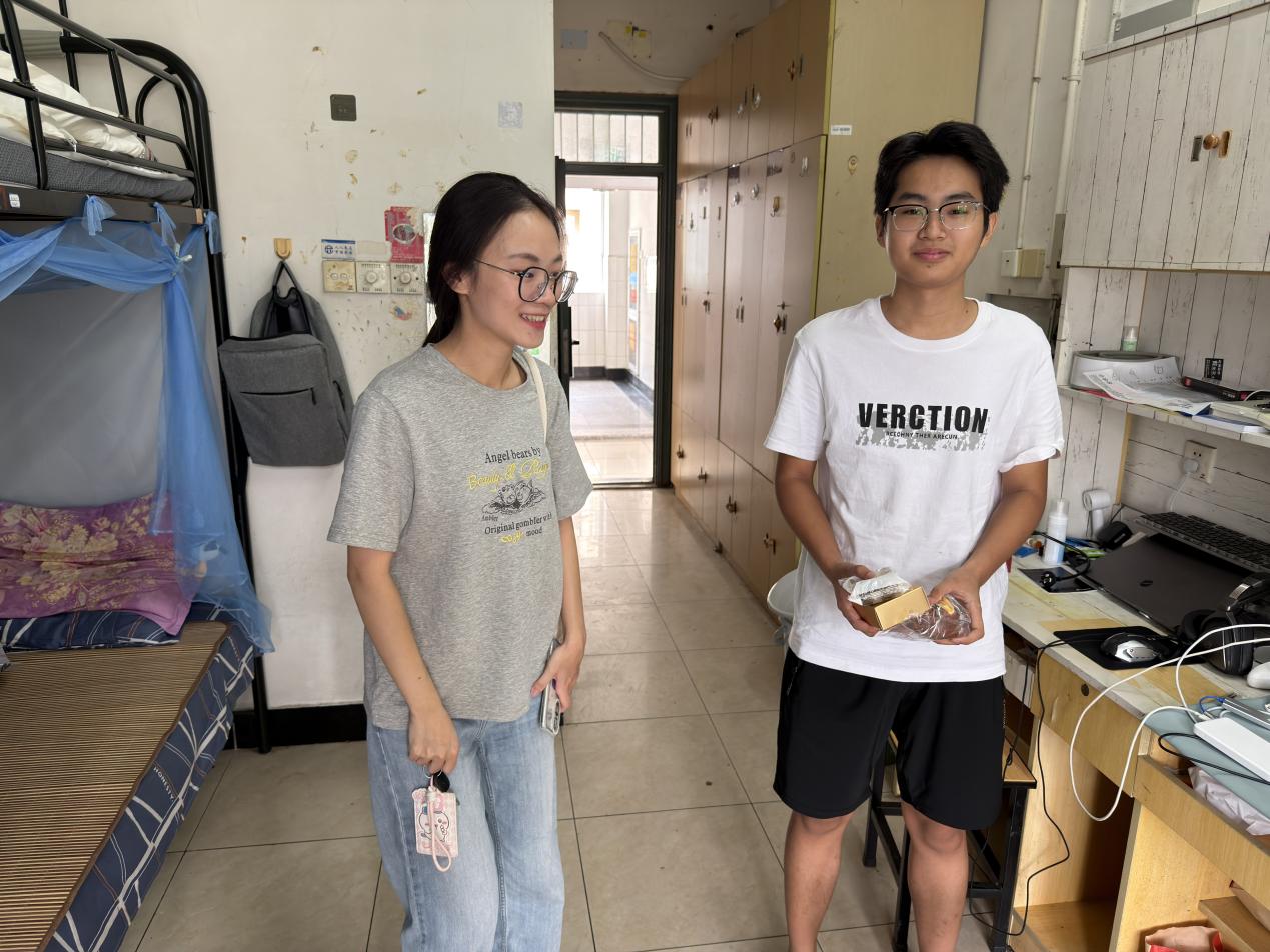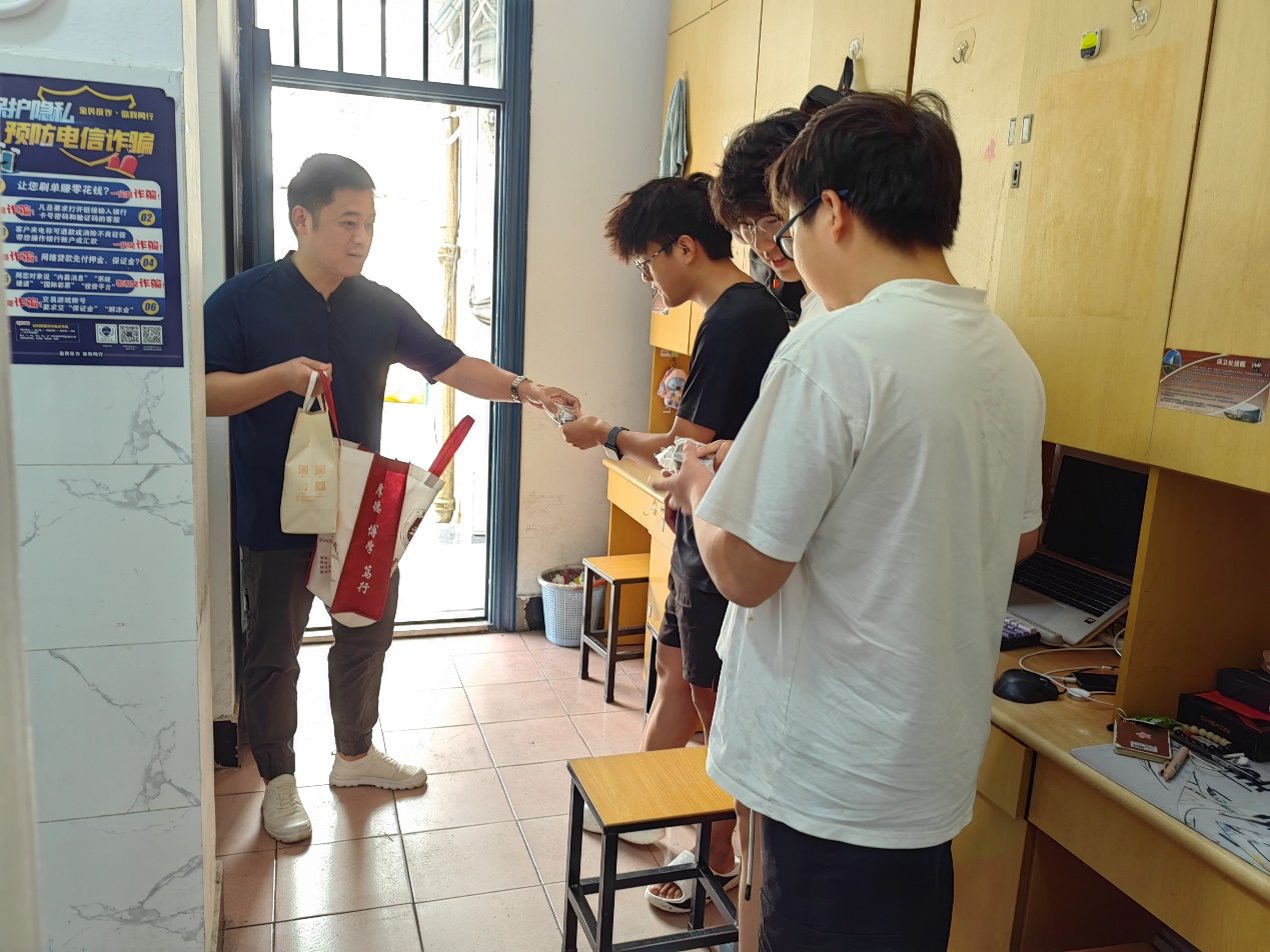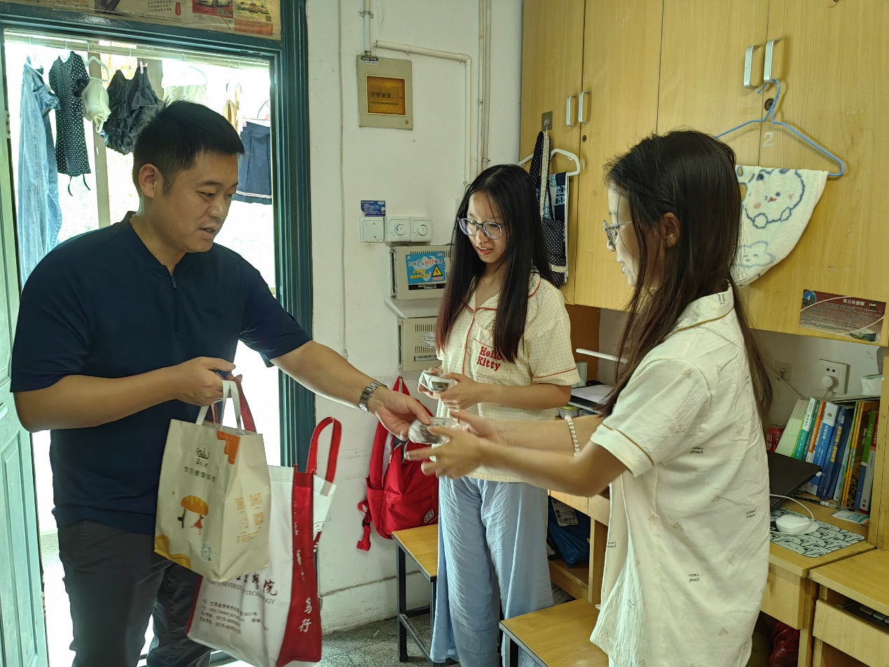 走访过程中,凌诚与新生辅导员逐一走进留校新生宿舍,与同学们亲切交谈。每到一处,他们都仔细询问新生的假期安排、学习生活情况及遇到的困难,并送上精心准备的月饼、面包等节日礼品。凌诚在交流中表示:"中秋是团圆的节日,学院始终牵挂着每一位留校新生。希望大家合理安排假期时间,既要放松身心,也要保持学习状态,遇到问题随时联系辅导员老师。"他特别叮嘱新生要尽快适应大学生活,珍惜同窗情谊,在化学化工学院这个大家庭中共同成长。