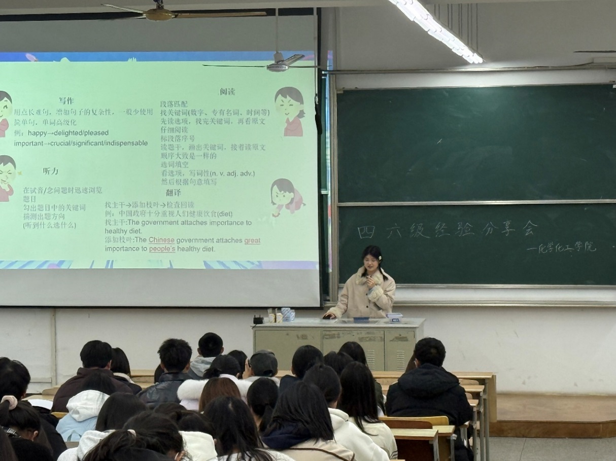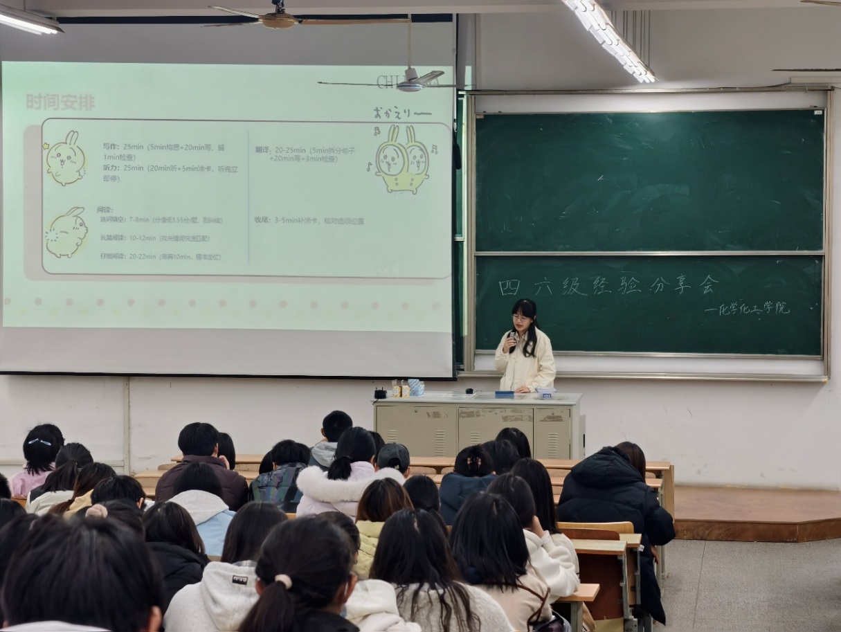为帮助同学们更有针对性地备战即将到来的全国大学英语四、六级考试,掌握高效备考方法与应试技巧,化学化工学院成功举办了四六级经验分享会。本次分享会邀请到在考试中取得优异成绩的23应化1S凡弋、24应化3纪皓月两位同学,她们结合自身的备考经历与实战体会,从不同角度为25级新生和其他年级待考同学带来了详尽而实用的经验分享。