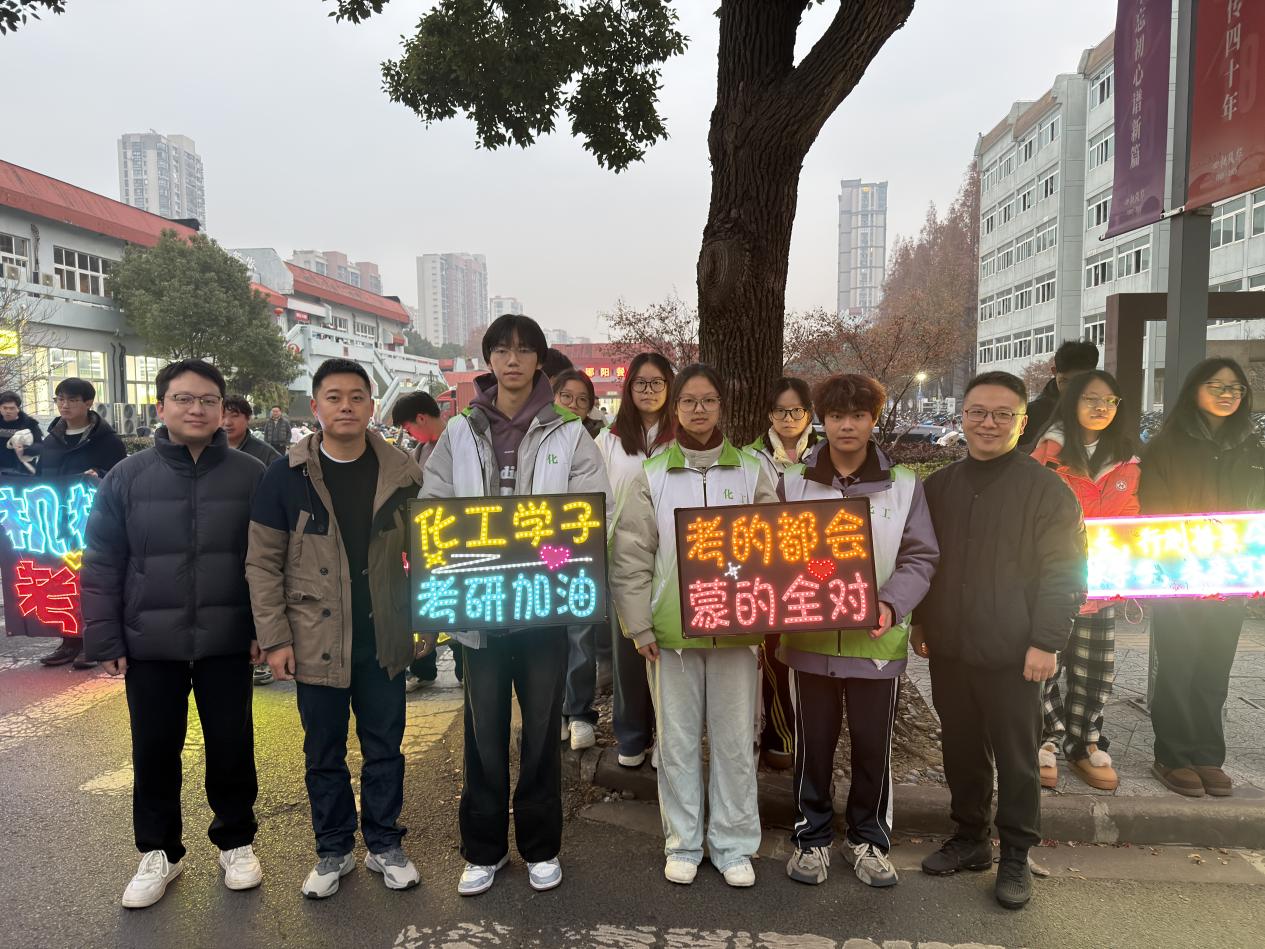 凌诚与学生们亲切交流,鼓励大家放松心态,从容应试。辅导员们则分工协作,仔细核对乘车学生名单与车辆信息,确保学生带好准考证、身份证、文具袋等考试必备物品。学生志愿者们手举“化工学子 考研加油”“考的都会 蒙的全对”的灯牌,为每一位考研学子加油鼓劲。7时整,满载考生的送考大巴准时启程,师生们挥手致意。