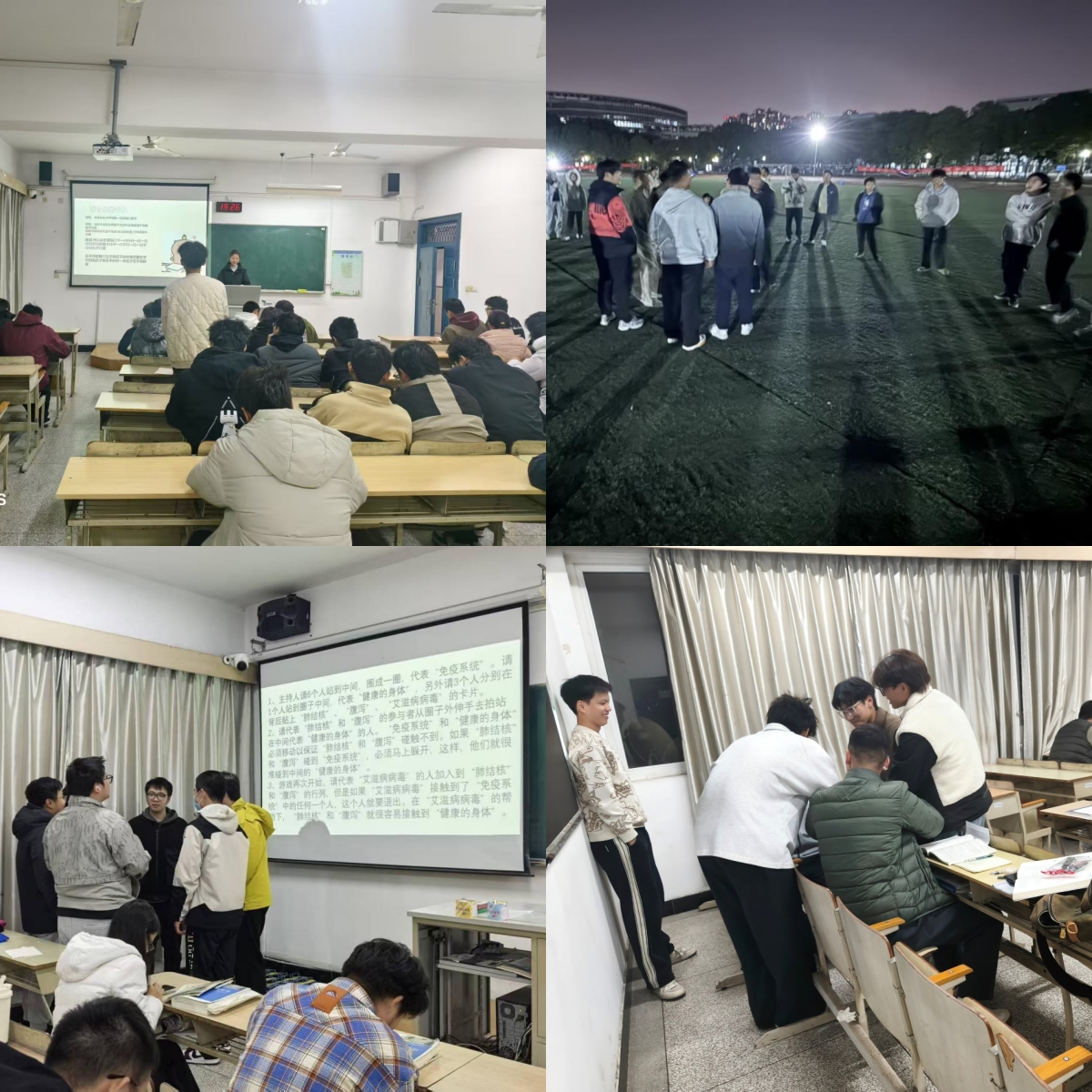 本次主题班会课以“知性防艾 青春健康”为核心理念,依托各班心理委员通过一系列形式新颖、互动性强的团体活动,让新生在轻松氛围中学习相关知识。在“树立正确性认知”环节,通过动物成语、叠词游戏等趣味互动消除敏感话题神秘感,再以价值投票形式澄清生理健康知识误区,帮助新生建立对性的科学认知;“认识艾滋病”系列活动中,“野火游戏”直观展现了HIV的传播速度,人体免疫系统模拟游戏生动诠释了病毒致病机理,“传言和真相”意见选择活动则有效破除了对艾滋病的误解与恐惧,而危险行为与传播途径辨识环节让新生精准掌握了高危、低危及无危行为的区分标准。