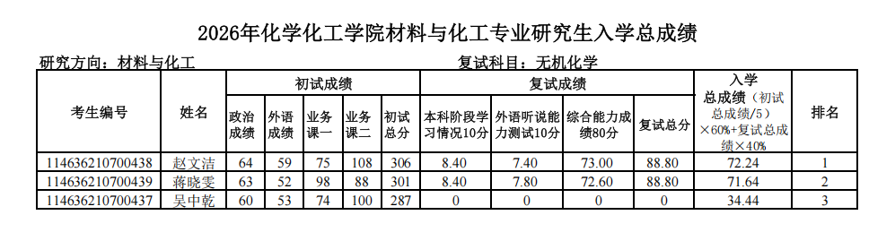 2026年化学化工学院材料与化工专业研究生入学总成绩公示