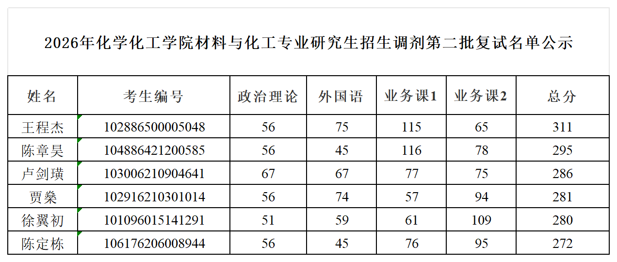 2026年化学化工学院材料与化工专业研究生招生调剂第二批复试名单公示